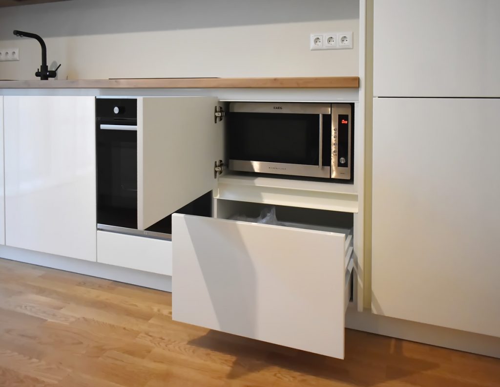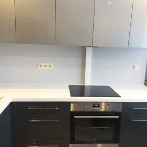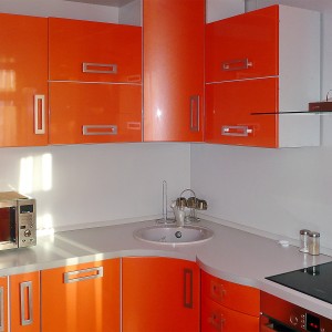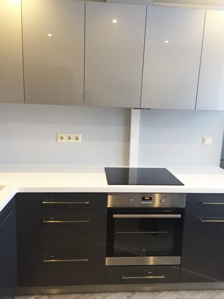 Кухня угловая. Фасады и корпус – акрил. Столешница – кварцевый агломерат. Фартук на стене – каленое стекло с фотопринтом.