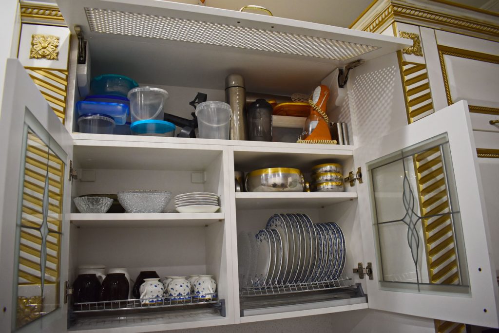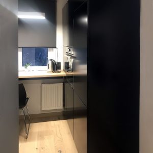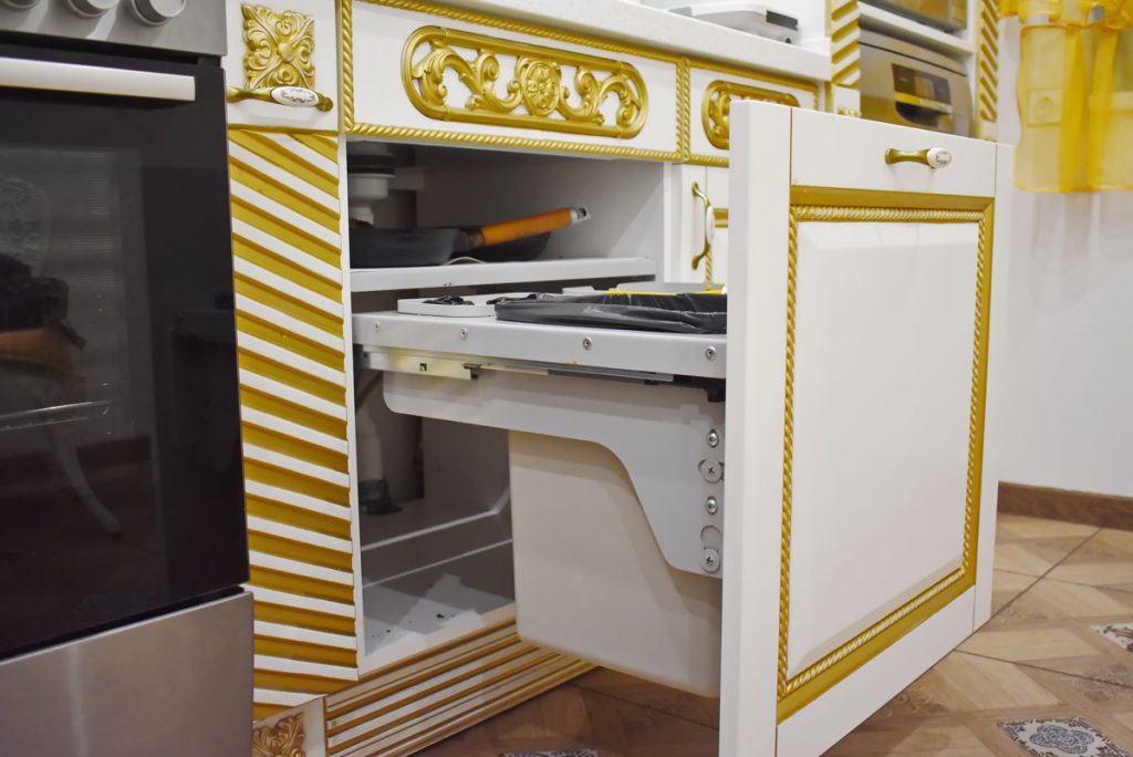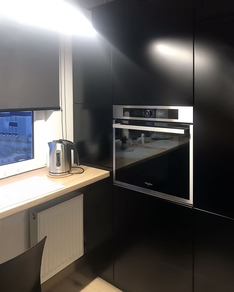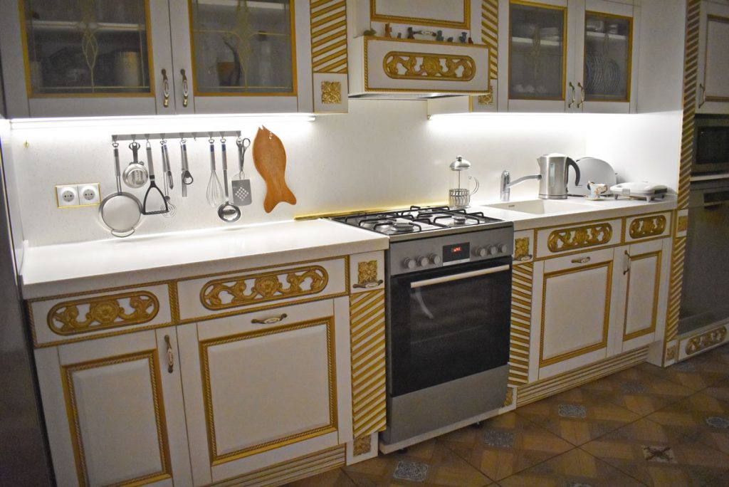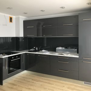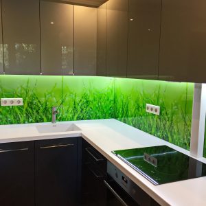 Элементы отделки кухни. Фартук-фотопечать на стекле, алюминиевая кромка столешницы, фасады – МДФ крашеный, глянцевый.